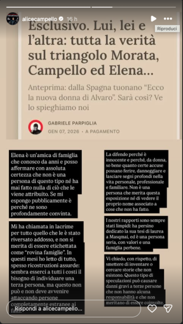 La modella ha spiegato che in questi mesi ha letto “ricostruzioni assurde” solo per giustificare la presenza di una “terza persona” tra lei e Alvaro.