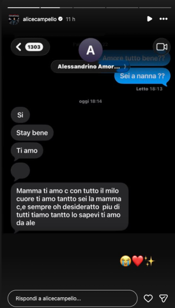 Non solo lei non ha voluto commentare l’ennesimo gossip sul suo matrimonio, ma ha pubblicato una storia su Instagram che difficilmente sarebbe passata inosservata. È uno dolce scambio tra lei e Alessandro, uno dei due gemelli nati nel 2018. Alice chiede notizie al bambino, chiedendo se è già pronto per andare a letto, e lui risponde con un messaggio davvero commovente.