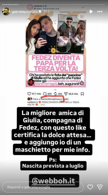 A far riaccendere il gossip questa volta è un like su Instagram messo da una delle migliori amiche di Giulia che confermerebbe che l’esperta di marketing è incinta. A riportare la notizia è il giornalista Gabriele Parapiglia, che fornisce qualche dettaglio in più sulla gravidanza: