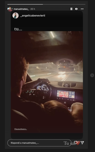 Inoltre, Angelica ha condiviso sulle stories una dolce foto di lei e Manuel in macchina. Di sottofondo c’è “Sono Pazza Di Te” di Elodie, e Manuel non ha esitato a ripostarla sul suo Instagram scrivendo un semplice ma chiaro “Tu sai”.