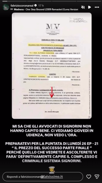 In particolare si legge ancora nel ricorso che l’eventuale diffusione di nuovi contenuti diffamatori porterebbe a una diffusione incontrollabile, generando così un ulteriore danno alla “vita personale e professionale” del conduttore. La risposta di Fabrizio Corona non si è fatta attendere, arrivata attraverso il proprio profilo Instagram con una storia in cui annuncia di dare battaglia in udienza. Nella storia infatti si può leggere: