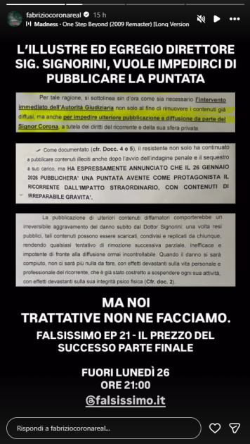 Proprio per impedire l’uscita dell’ultima puntata si è mosso in anticipo Alfonso Signorini attraverso i suoi legali, che hanno richiesto “l’intervento urgente dell’Autorità Giudiziaria non solo al fine di rimuovere i contenuti già diffusi, ma anche per impedire ulteriore pubblicazione e diffusione da parte del signor Corona”.