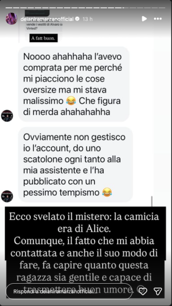 La spiegazione, in realtà, era un’altra. La camicia in questione, nonostante sia da uomo, era la sua. A dirlo è stata la stessa Alice scrivendo in privato all’esperta di gossip Deianira Marzano. Ha spiegato che, essendo amante dei vestiti oversize, l’aveva comprata per lei tempo fa ma non le stava bene.