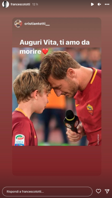 Ed anche Cristian ha utilizzato le stories per dedicare delle dolci parole al papà. Ha pubblicato una foto dove entrambi sono sul campo da calcio, maglietta della Roma indosso, e la testa dell’uno appoggiata a quella dell’altro. La dedica altrettanto dolce: “Auguri Vita, ti amo da morire”. Ovviamente anche questa è stata ripostata dal padre.
