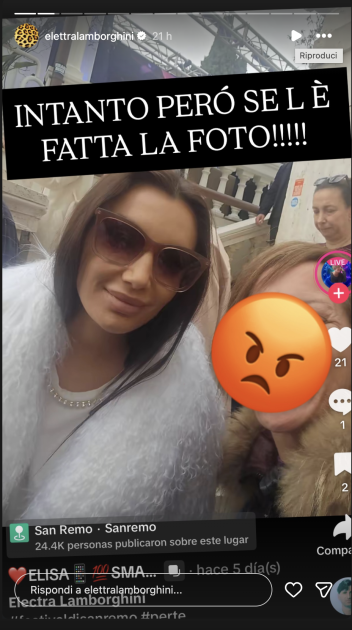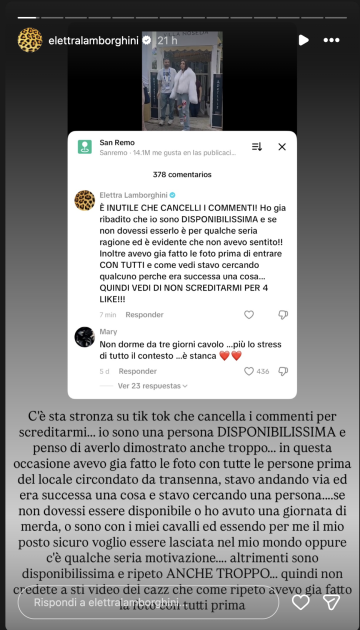 Tutto è iniziato quando una sua fan ha pubblicato un video su TikTok in cui si lamentava di Elettra Lamborghini, accusandola di non essere stata disponibile per scattarsi una foto insieme. Video che la cantante ha visto e ha scelto di commentare, commento però subito cancellato dalla fan che aveva postato il video.