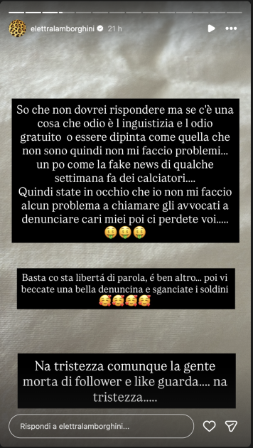 Infine, nelle ultime tre storie, Elettra Lamborghini esorta i propri fan a non credere a tutto ciò che si vede sui social, spiegando che a volte i contenuti sono distorti per ottenere like e follower. La cantante lascia anche intendere che potrebbe sempre rivolgersi ai propri avvocati e denunciare le calunnie.