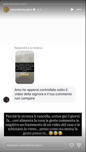 Elettra, a questo punto, ha condiviso sul proprio profilo Instagram quanto successo fino a quel momento attraverso una storia, in cui è possibile vedere lo screenshot di un nuovo commento fatto su TikTok, con qualche riga in più: