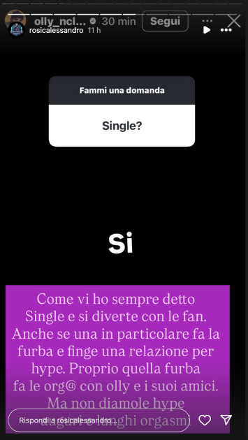 Ora è stato finalmente il diretto interessato a rispondere. Dopo aver aperto un box domande nelle sue storie, Olly ha risposto a chi gli chiedeva se fosse single scrivendo un semplice: “Sì”.