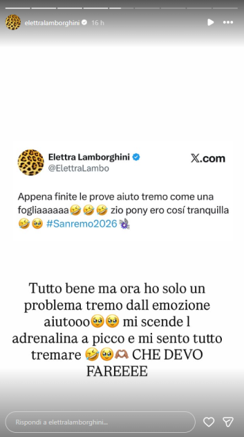 Insomma, vediamo come se la stanno cavando alcuni dei protagonisti. In particolare, ieri ha attirato l’attenzione mediatica su di sé Elettra Lamborghini. Dopo le prove generali, il suo stato d’animo, dopo essersi caricata con la sua esibizione, era alle stelle, ma poi, una volta finita, ha dovuto fare i conti con lo scarico di adrenalina, come ha ammesso lei stessa attraverso una storia sul suo profilo Instagram.