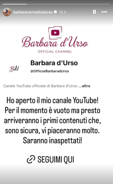 Con un post, Barbara d’Urso ha presentato il suo nuovo progetto: ha aperto un canale YouTube. La conduttrice ha specificato che per il momento il canale è vuoto, ma che presto arriveranno dei contenuti esclusivi e inaspettati, che i fan apprezzeranno molto.