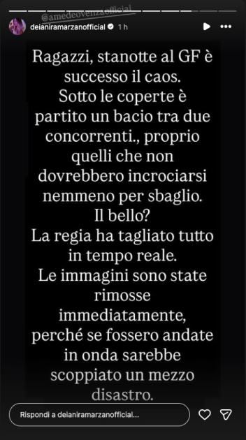 A diffondere l’indiscrezione è stata Deianira Marzano, che ha spiegato che ci sarebbe stato un bacio sotto le coperte tra due che “non si sarebbero dovuti incrociare neanche per sbaglio”.